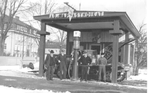 Text på baksidan av foto: Carl Kronvall, Oskar Stenberg, Sjölander, Fred Karlsson. O Stenberg o. Sjölander var föreståndare för macken, F Karlsson anställd. Området helt sanerat från bensinstationen nov 2003. Följande text ur häftet KV. Svärdet och Nyckeln Falkenberg.1987. 1933 etablerade sig AB Nafta Syndikat. Senare övertogs stationen av Sv Gulf Oil AB, bensinstationen har 1986 ombyggts till en enklare, obemanad tappstation.