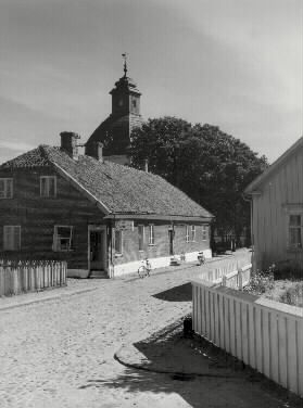 På affärsskyltarna kan man läsa Nilssons Charkuteri inh K Melbäck och Läsrum för sjöfolk. Byggnadsår 1829. Byggherre Falkenbergs stadsförsamling. Byggnaden utgjorde prästbostad till 1891, då fastigheten försåldes till enskild person. I serien ingår bilder som är tagna 1953-54, därför är antagligen också denna bild från något av dessa år.