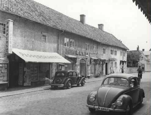 PÅ affärsskyltarna kan man läsa, Pappershandel (Rasmussons), Resia, Ny Tid, Skånska Hembageriet, Östmans Trädgård. I serien ingår bilder som är tagna 1953-54, därför är antagligen också denna bild från något av dessa år.