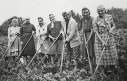 Bild 1:Att luka betor var ett strängt arbete. Här är det en grupp polskor från flyktinglägret i Heberg som 1945 hjälper till på Backagård, granne med lägret i folkskolan.(Foto genom Ulla Holmers) Bild 2 o 3: Även vid höskörden deltog polskorna på gårdarna runt om i Heberg. (Fotot genom Siw Ranlid.)