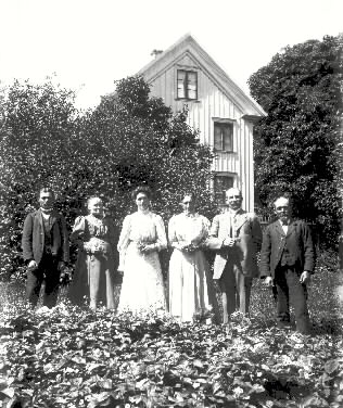 Attarp vid jordgubbslandet. Fr.v. Per, Josefina, x,x, Verkenhoff o Per Alfred. A Fridolf Persson var lärare i Årstad 1904-1912, Fritsla 1912-1920, Släp 1921-27 och Skrea 1927-41. Enl. sonen Einar Persson.
