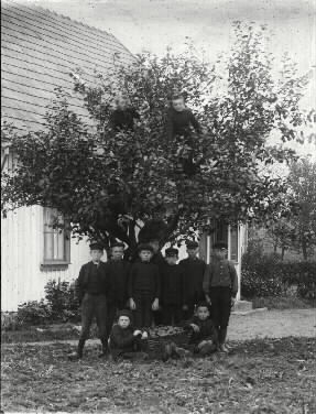 Pojkar från Årstads skola visar upp sin äppelskörd i en stor korg.