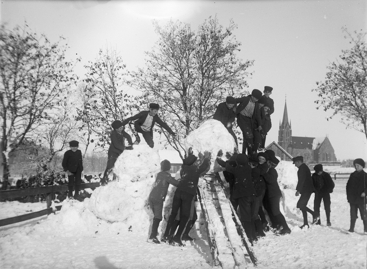 Elever från Årstads skola roar sig i snön på rasten, med Årstads kyrka i bakgrunden.