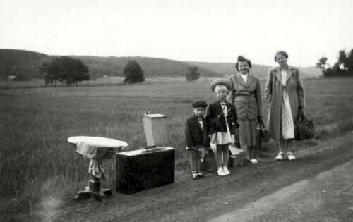 Text på fotot: Avresa från Ekeberg efter (semestern?) 1951. Från vänster Leif, Ulla, Maj-Britt och Anna.