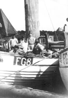 Bild 1:Karl Svensson "Sares-Kal" med hatt övriga okända. Bild 2:Karl Svensson "Sares-Kal" från Stafsinge med hatt, vid masten troligen Erik Mårtensson i fören Bror Mårtensson, övriga okända. Bild 3: Bror Mårtensson, Oskar Jönsson och Karl Svensson lägger ut sillgarn. John Jönsson matar ut från lastrummet.