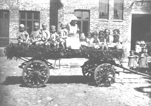 Bifogad text till fotot. Barnens Dag. (Blåbärspojkar och Lingonflickor) Elsners fotoatelje har tagit kortet. Taget å Teatersalongens gård (Schubergsvägen) mitt emot stationen. Fr. v. till h.: K-A Johansson, okänd, T Dahl, K-G Ander, G Andersson, S Salander, fyra okända, G Skantze, okänd.