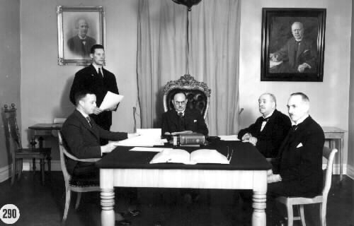 1937 hade Falkenbergs rådhusrättsin sista ordinarie session. På ordförande platsen t.f borgmästare CASSEL Ivan , till vänster t.f. förste rådman HERRLIN Hilding, t.h andre rådman TOMANDER Oskar (närmast borgmästaren) och extra rådmannen LUNDIN I.W.A. Stående åklagaren t.f stadsfiskal JOHANSSON Yngve. Det sammanträde Falkenbergs rådhusrätt höll i går med början kl. 10 f.m. var den sista av de regelbundet återkommande ordinarie sessioner rådhusrätten i staden hållit sedan mer än 600 år. Falkenberg kommer fr.o.m. årsskiftet att förläggas under landsrätt och därmed är stadens egen urgamla domstol ett minne blott. Utdrag ur Falkenbergs Tidning 1937-12-28