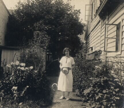 Text på baksidan. Bild 1-2 Gurli hemmma i trädgården. Bild 3 Hilding i trädgården. Förvärv från Anna-Lisa Nilsson innehavare av antikvitetsaffär i Falkenberg fram till 1985. Genom en auktion kom hon över div. föremål efter Patrik Johnsons kvarlåtenskap. De har sedan dess (1971) legat på hennes vind i Abild prästgård. Föremålen överlämnade från A-L Nilssons dödsbo av döttrarna Marie Louise Andersson, Viveka Linderström Sthlm o Anita Skantze Ullared.
