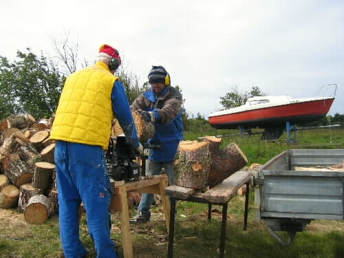 Bild 1:Vedklyvning i Stubbhult. Lars Wikander i gul väst hjälper Ulf Källqvist. Bild 2:Den som lärt upp Ulf Källqvist när det gäller att använda vedklyven är Bertil Ahlberg i Stubbhult. Bild 3: Ulf lär i sin tur ut vedklyvningens moment till nästa generation. Här instrueras Jesper och Joakim Sundgren.