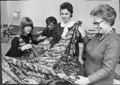 Greta Nilsson-Bergström i sin syateljé, hos Bigges, 3:e vån, Fbg. Innehade damskrädderi 1945-1975 i Fbg. Fotot tagit för en artikel i tidningen, då hennes syateljé 25-års jubilerade. Fr.v. SONNHAG Margareta, har syateljé i Halmstad. STENSSON Majlis, g Fritzson JOHANSSON Marianne Inger NILSSON Greta. De två förstnämnda tog gesällprov hos Greta.