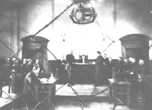 Bild 2: Vid domarbordet, JACOBSON G landsfiskal, ANKARLOO M E, EBBESON vaktmästare, MÖLLER redaktör vid pressbordet, Till vänster närmast dörren: Nämndeman WENNERHOLM Emil i Sjönevad, nämndeman JOHANSSON Sven Carl i Årstad, nämndeman HELLSTRÖM Johan Edv.i Slättelynga, nämndeman SVENSSON Albin I Ekhult Drängsered, nämndeman CARLSSON Elias i Junkagård Krogsered, nämndeman PERSSON Nils Peter i Perstorp? Till höger närmast dörren, Nämndeman LARSSON Johan i Skrea, nämndeman NILSSON Adolf i Eftra, nämndeman SVENSSON Hilmer i Måsared (sedan Getinge), nämndeman uppgift saknas, nämndeman JOHANSSON Karl i Berg.