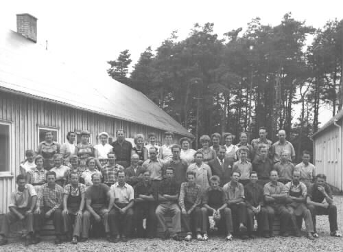 Gruppbild - skoarbetare och nåtlerskor vid Ljungsko skofabrik. Med skofabriken bakom. Nedersta raden från v. 7:e KARLSSON Hilding, 11:e ANDERSSON Johan, 12:e LARSSON Anders, 14: ISAKSSON. Mitten raden fr.v. 8:e BENGTSSON Hilding, 11:e ANDERSSON Nisse, fabrikör, 15:e EKENHARD Bror-Erik. Översta raden fr.v. 3.e Laila, 8:e GUSTAVSSON Siv, 9:e LARSSON Dasiy. A
