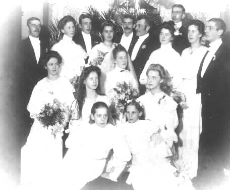 På separat bladföljande text. Bröllopsfotografi från Anna Stenbergs bröllop med Axel Pettersson c:a 1904 el. 1905. Över raden stående: ! C Moberg, 2 M Boman, 3 J Stenberg, 4 E Sunesson, modern f. Broman, 5 okänd, 6 brudgummen A Pettersson, 7 S Kristensson, 8 O Lindqvist, 9 H Andersson, 10 E Lundgren, målare. Nedre raden sittande: 1 E Mångberg, 2 G Jernberg, 3 bruden Anna Stenberg, dotter till bankdirektör Carl Stenberg, 4 D Westergren, gift Gyllensvärd-Jerlov. Nederst: 2 okända flickor. A Pettersson var kamrer på valskvarnen, kom sedan till Smålandsbanken, satte upp egen fiskhandel.