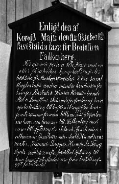 Text på tavlan. Enligt den af Kongl:Majts den 11te Oktober 1825 faststälda taxa för Brotullen Falkenberg. För gående person 1 öre# Wagn med en eller flera hästarhvarje häst 5 öre# för lös häst 3 öre# för Boskapskreatur 2 öre# samt Ungboskap&andra mindre kreatur 1 öre för hvarje# i Årstads&Faruås Härader boende Stats&Landtboer skola vid överfarten af bron njuta lindring till hälften i broafgiften# hvarjemte samma förmån tillkommer vid återfartenen hvar som kommer till Falkenberg med varor till afyttring. Embets och Tjenstemän i allmäna tjensteärender stadde# Kronotransporter, Tågade Trupper, Kronopost&Fångskjuts, samt de som efter förrättad skjutsning till sina hemvist återfärdas äro från brotullsafgift frikallade