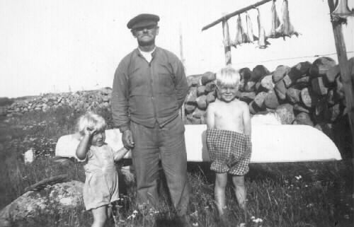 Johan Bengtsson, adress Olofsbo 4 levde med familj på 4 tunnland jord och fiske. Han hade för vana att gå längs stranden och samla drivved till bränne. När hans händer inte orkade att bära längre på ålderns höst, drog han veden efter sig i en fisklåda och snöre över axeln. Johan blev 102,5 år gammal. Här med barnbarnen Ann-Christine och Erling Bengtsson. Uppe till höger ses torsk hänga på tork ( läs mer om den i mappen samlingar/dok/mat). I bakgrunden Hildings egen tillverkade segelkanot. Läs mer om Johan i boken Olofsbo vår hemby 1996.