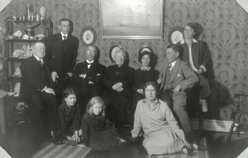 Antagligen familjen Johnson. I mitten Jenny t h om henne Patrik och t v Gurli, övriga är ej kända till utseende. Förvärv från Anna-Lisa Nilsson innehavare av antikvitetsaffär i Falkenberg fram till 1985. Genom en auktion kom hon över div. föremål efter Patrik Johnsons kvarlåtenskap. De har sedan dess (1971) legat på hennes vind i Abild prästgård. Föremålen överlämnade från A-L Nilssons dödsbo av döttrarna Marie Louise Andersson, Viveka Linderström Sthlm o Anita Skantze Ullared.