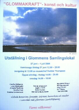 Bild 1 Glommakraft En grupp kreativa människor med anknytning till Glommen har sedan några år haft en återkommande utställning. Den har kunnat ses i Glommens samlingslokal. Konstnärer, fotografer, hantverkare, författare i samarbete med Glommens Samhällsförening. Bild 2 Förberedelser in i det sista. Bengt Johansson och Käte Laurent. Bild 3 Lena Björnquist hänger sina akvareller med strandmotiv. Bild 4 Halsband av klor från egenfångade krabbor såldes av Lars Wikander. Bild 5 Ordföranden i Glommakraft 2009, Bengt Winblad, hälsar välkommen vid vernissagen. Bild 6 Trubaduren Bengt X underhöll med sköna visor vid invigningen av årets Glommakraft. Bild 7 Museichefen Debbie Thompson invigningstalade och öppnade utställningen.