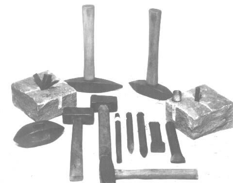 Bild 1: Ovan fr.v. Bredkil med bredkilsbleck nedslagna i en sten, upprensarhacka (för att hugga bredkilshål), mellanhacka. Nedre raden fr.v. hacka utan skaft, brysthacka (för bredkilshål), putshammare (anv. ofta för kantjärn för att få raka kanter på kantsten), stockhammare - ena slagytan ruträfflad. Därefter tredje mejseln, spetsmejsel (för att mejsla bort knutor o för bearbetning av stenar, kantjärn (för raka kanter på kantsten), ritsmejsel ( för att underlätta klyvning av sten). Bild 2: Ovan fr.v. 1) mellanhacka, 4) stockhammare, 5) putshammare, 6) borrhammare, 8) borrhammare, 9) upprensarhacka. Andra raden fr.v. upprensarhacka, nedslagen i sten bredkil o bredkilsbleck. Första mejseln t.v. av grupp om 5 st. ritsmejsel, av de två järnen i mitten på fotot, det t.v. kantjärn, borrkusa - av ljung, träddes på borret vid borrning indrängt i vatten för att skydda stenhuggaren från flisor. Under borrkusan, brysthacka, andra borret under denna, borr 8-linjers - åttakantigt borr.