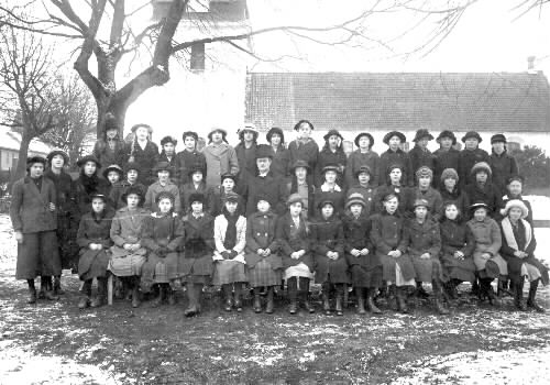 Följande text från löst anteckningsblad: Skolkort med blandadklass o. Lärarinna: frisör Ericsson i översta raden Tekla Jönsson identifierade. Konfirmationskort med D Davidsons grupp (flickor) vid gamla kyrkan. 1916 Nere raden fr.v. X, Rika Lindström, Karin Johansson, X, Anna Svensson, Edit Karlsson, Ebba Träffenberg, Märta Larsson, X, X, Gertrud Svensson, Anna Johansson, Elsa Nilsson, Freja Pettersson, Rosa Viborg. Andra raden: Margareta Nilsson, Svea Larsson, Tekla Jönsson, Linnea Carlsson, X, Sigrid, X, X, D Davidson, Hulda Gustafssson, X, X, Stanz Josefsson, X, X, X, Ebba Karlssson. Översta raden: Johanna Andersson, X, Svenborg Nilsson, Karin Bengtsson, Agda, Anna-Vera Bäckvall, Anna-Lill Reinholdsson, Astrid Elmgren, Hulda Maria, X, X, Armida, Britta Kronvall, Elna Nilsson, Anna Larsson, Anna Pettersson.