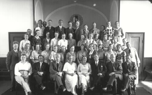 Gruppfoto Baptistkyrkan i Falkenberg 1936. Personer från vänster räknat. Övre raden:x,x,x,GLIMBY Bertil, x,x,x,x, ANDERSON Anna, x, SKOOG Hulda. Rad 2: x,x,x,x,x, ISAKSSON Märta, x,x,x, TULLBERG Signe, x, x, SALOMONSSON Ellen?. Rad 3: x,x, FURUHOLM Lisa?, x,x, ANDERSSON Maj, FRANSSON Anna?, GÖRANSSON/ÖBERG Judit, PETTERSSON Hulda, NYQVIST Eva, TULLBERG Eva, ANDERSSON Alice, BENGTSSON Hedvig. Nedre raden: EKROTH Joel, SWEDBERG Ruben, SWEDBERG, LARSSON Karin, LARSSON Karl Anton, JOHANSSON Herbert och okänd.