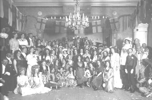 Maskerad på Stadshotellet våren 1912. Förteckning av personposition finns ihop med fotografiet.