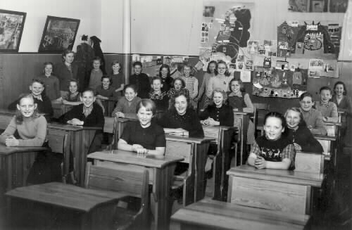 Bilden tagen i vårt klassrum på andra våningen på Möllevägsskolan troligen 1954. Fr.v. längst fram: G Nyström, S Andersson, R Antonsson. Nästa rad: L Hellgren, S-E Karlsson, U-B Andersson, M Pedersen. Nästa rad: G Svensson, T Bengtsson, G Andersson, N Karlsson. Nästa rad: B Hultin, B-Å Wallman, G Andersson, S Fransson, B Lorentsson,. St: M-B Eriksson, M Persson-Sjögren, G Karlsson, S Nilsson, U Lindbom J Johansson, L Johnsson, A-S Melin, G Lind. Saknas på bilden Kerstin Andersson och Marina Eriksson. Just vid den tiden bilden togs läste vi Europa. Teckningen på bilden föreställer Holland.