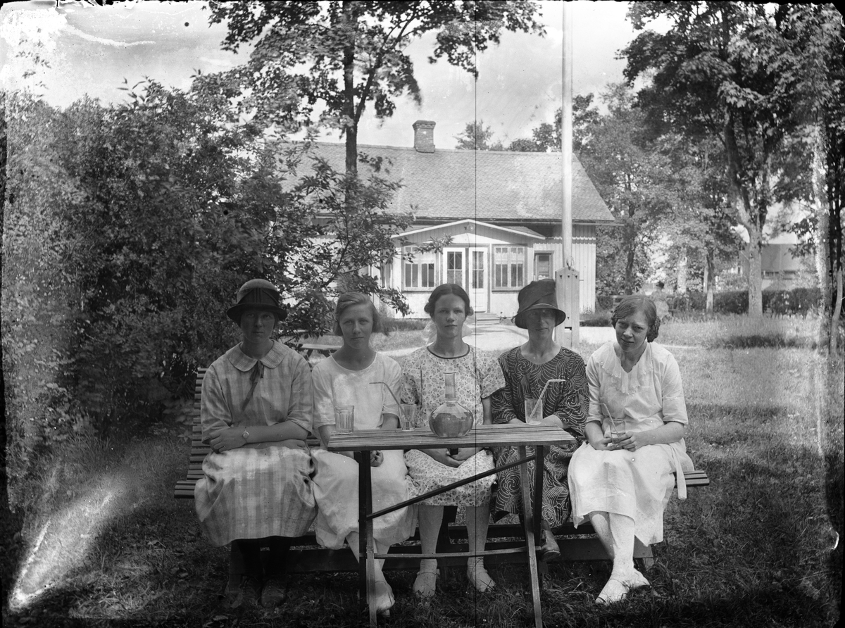 Dals Rostock. Brunnsparken med läkarvillan i bakgrunden. På bordet står vattenkaraff och glas med sugrör