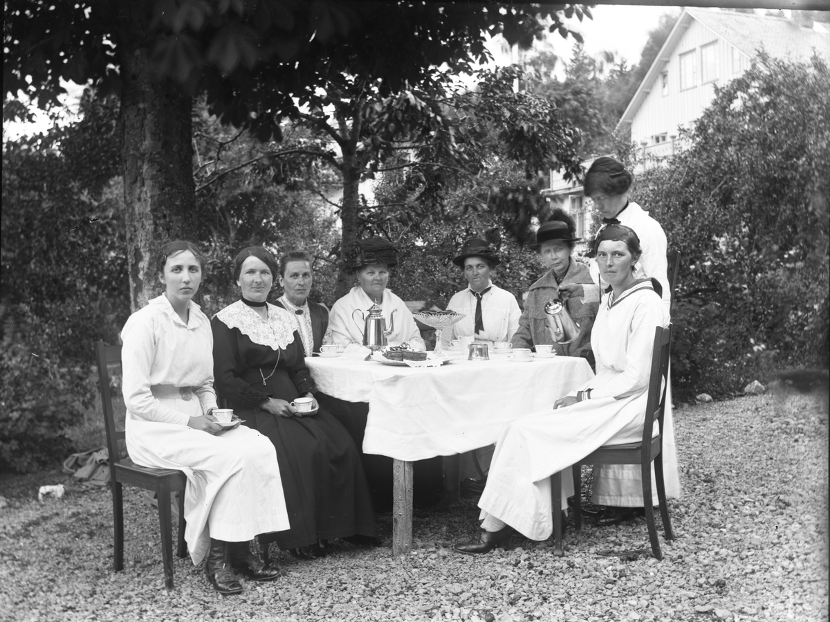 Dals Rostock. Åtta kvinnor dricker kaffe. I bakgrunden Törnqvists affär.