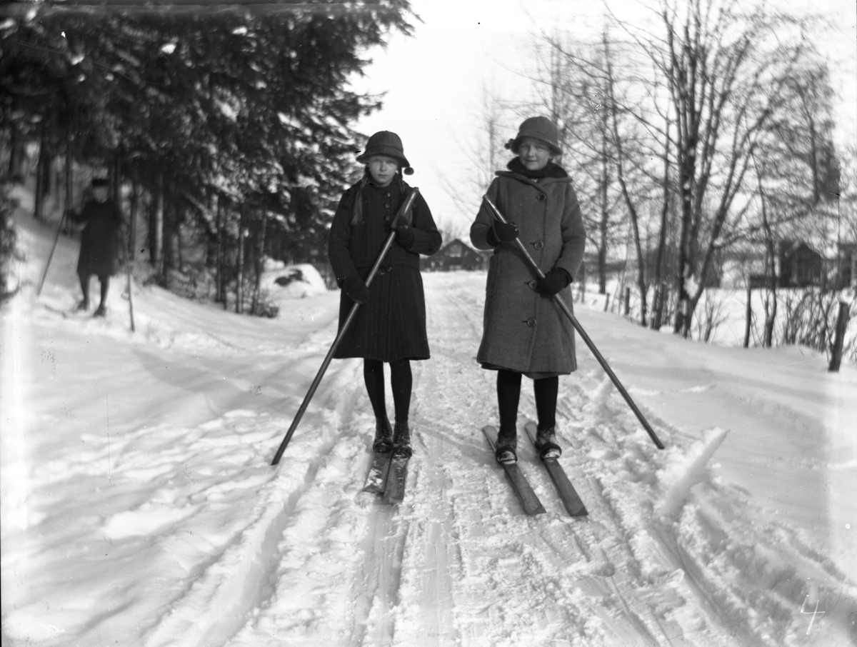 Dals Rostock. Två flickor som åker skidor på Brunnsvägen