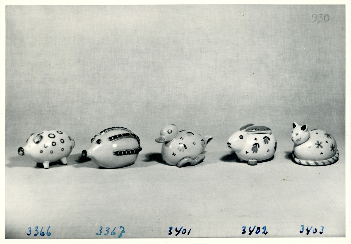 Sparbössor/Spargrisar från Bo Fajans, formgivare Eva Jancke-Björk, 1900-talets mitt. Gris, igelkott, anka, kanin och katt.