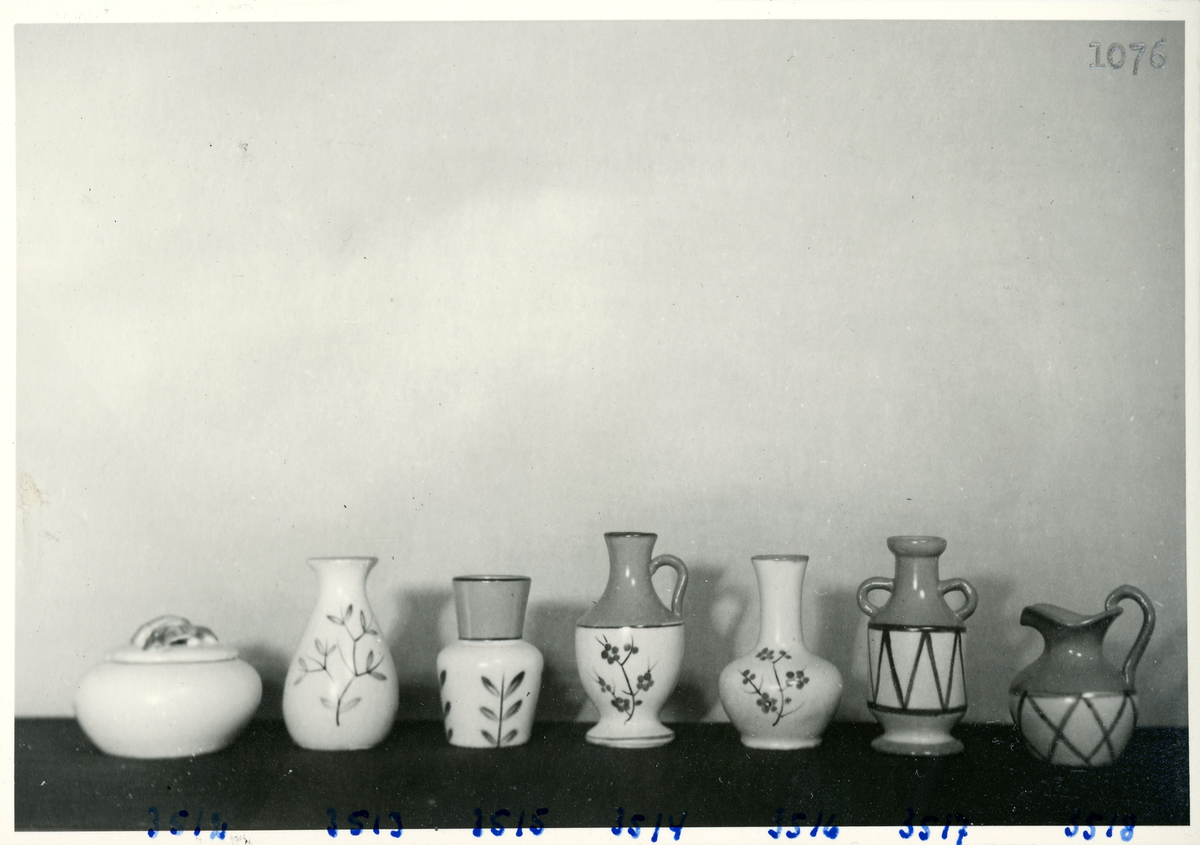 Miniatyrer. En bonbonjär, fyra vaser, ett krus samt en kanna från Bo Fajans, formgivare Eva Jancke-Björk, 1900-talets mitt.