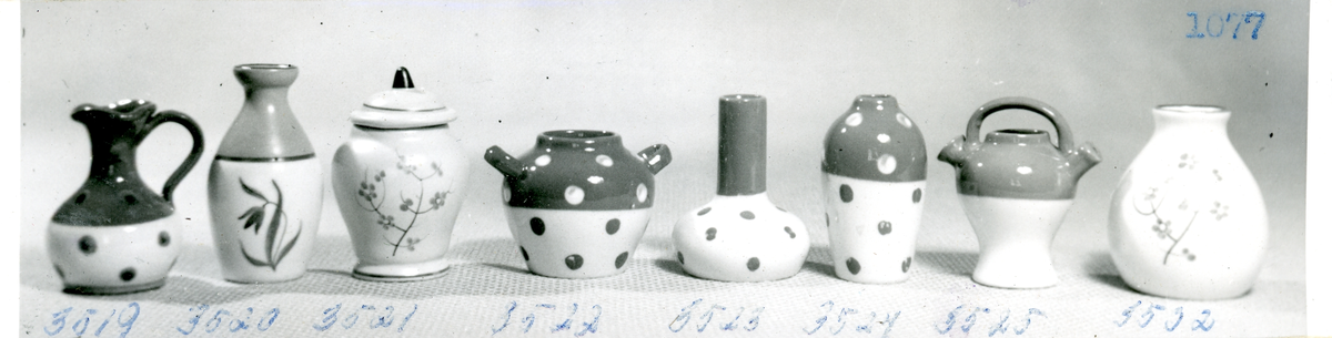 Miniatyrer. En kanna, fem vaser, en bojan samt ett krus från Bo Fajans, formgivare Eva Jancke-Björk, 1900-talets mitt.