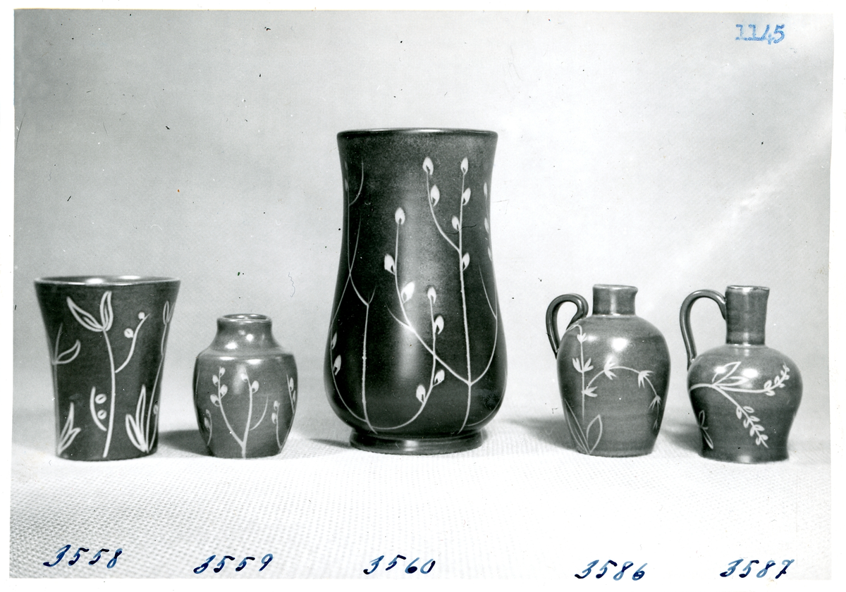 Bägare, vas och krus från Bo Fajans, formgivare Eva Jancke-Björk, 1900-talets mitt. Vaser i blå och grå glasyr med ristad vit dekor.