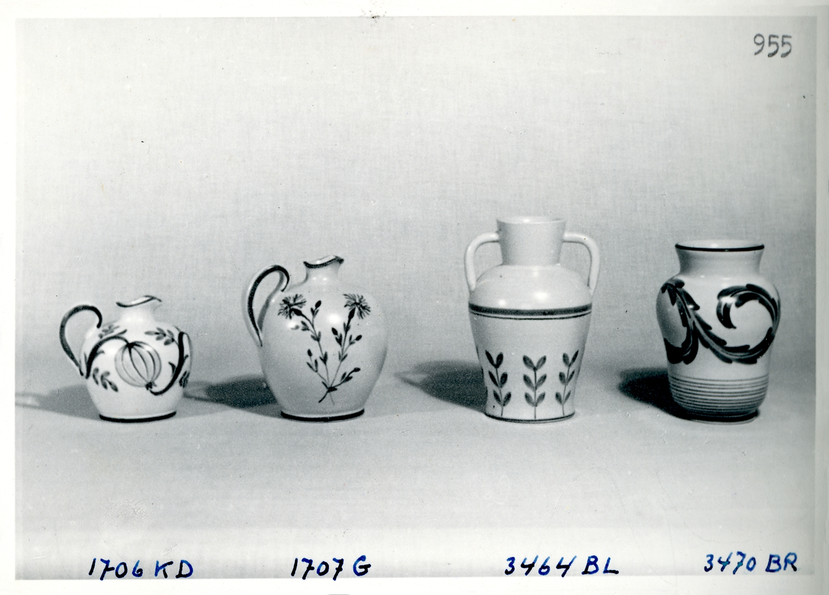 Två likörkrus, en bojan och vas från Bo Fajans, formgivan av Allan Ebeling och Eva Jancke-Björk, 1900-talets mitt.