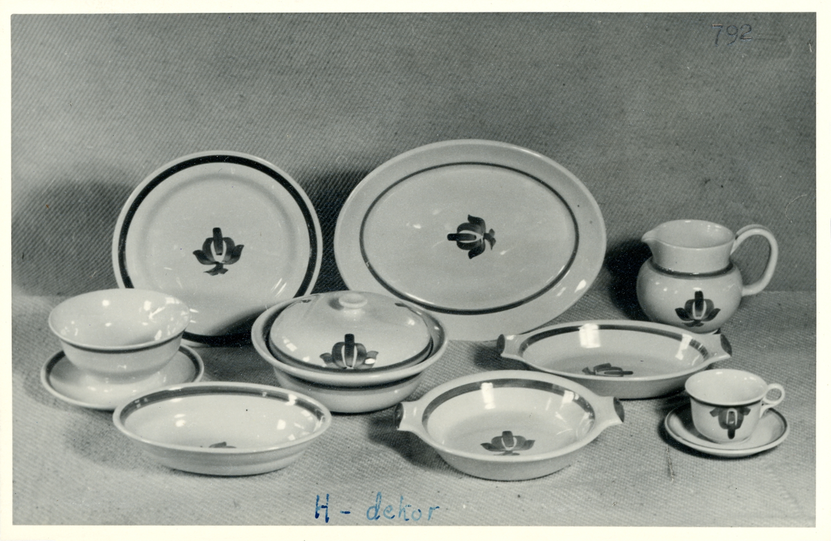 Hushållsgods med dekor H från Bo Fajans, formgivare Allan Ebeling och Eva Jancke-Björk, 1900-talets mitt.