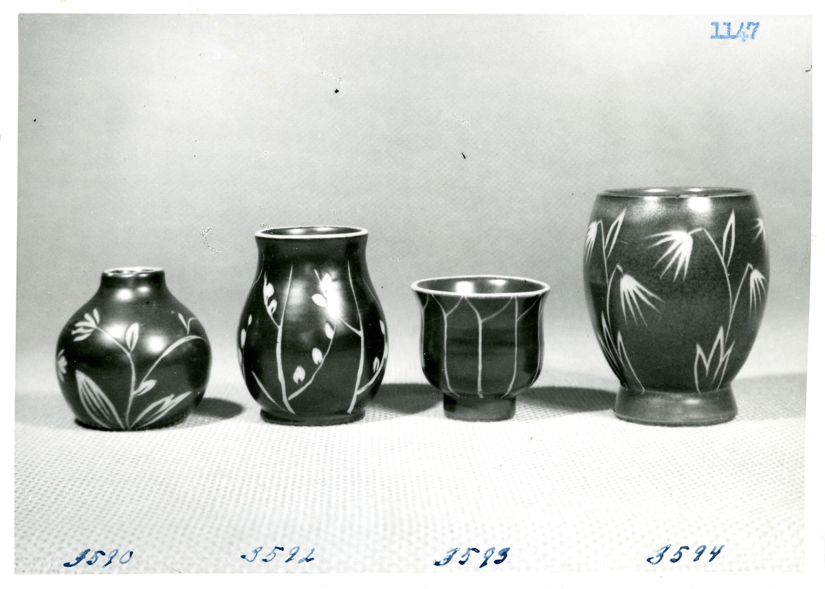 Tre vaser samt en bägare med ristad vit dekor från Bo Fajans, formgivare Eva Jancke-Björk, 1900-talets mitt.