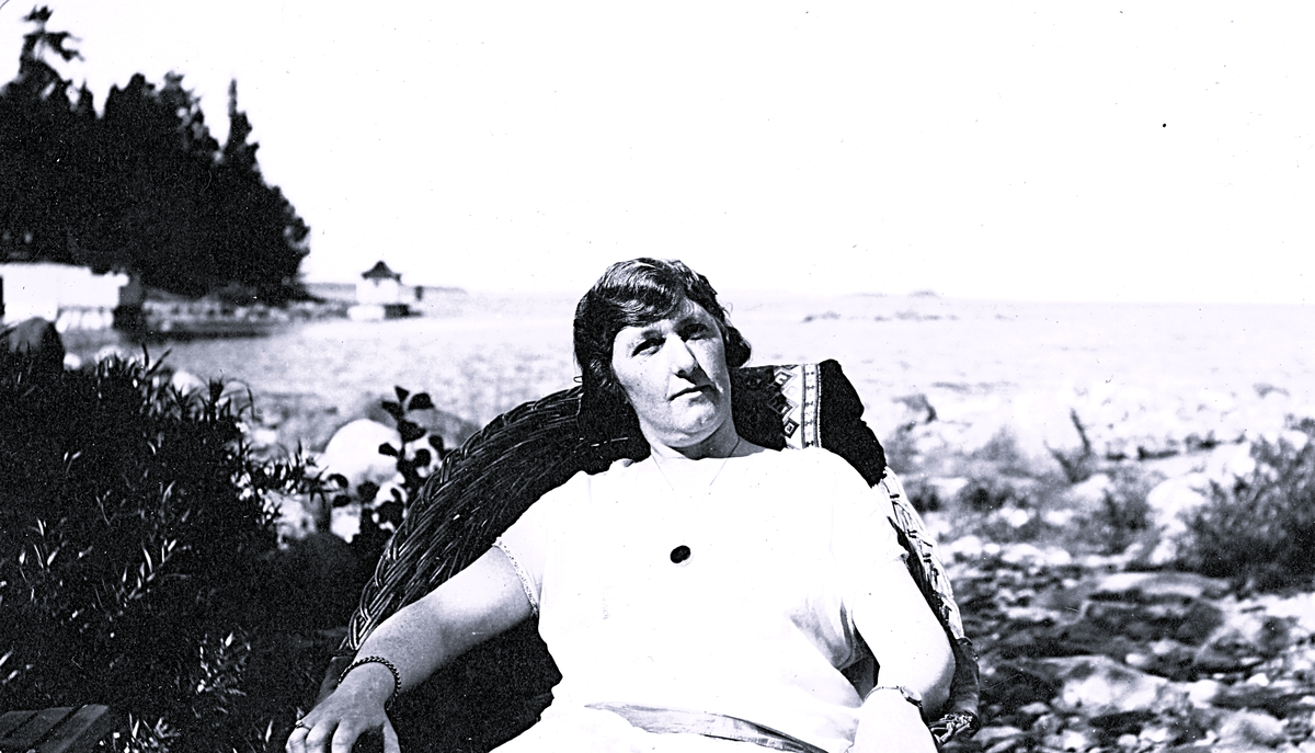 En kvinna som sitter utomhus i en korgstol med hav och klippor i bakgrunden. Text i album: "Furuvik, sommaren 1925".