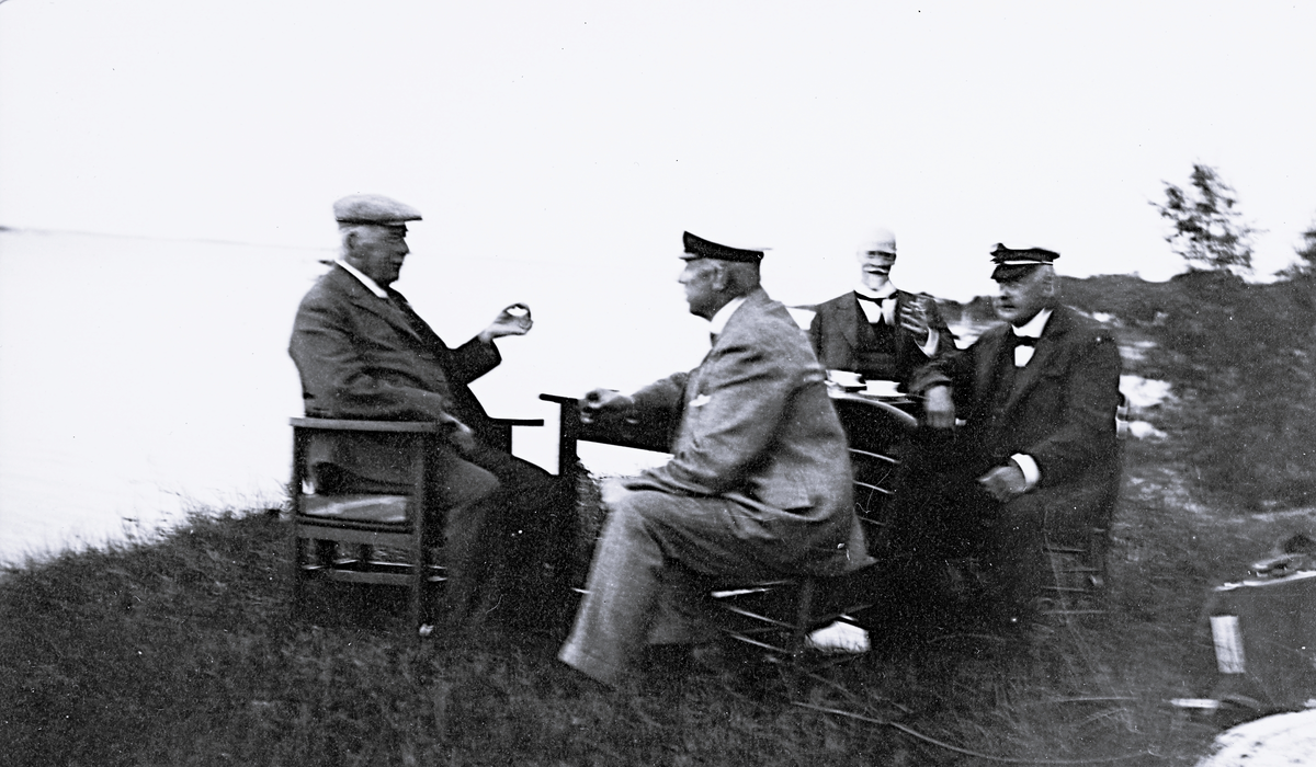 Titel: En grupp män som sitter utomhus och tar en fika med havet till vänster i bild. Text i album: "Marö 1924".