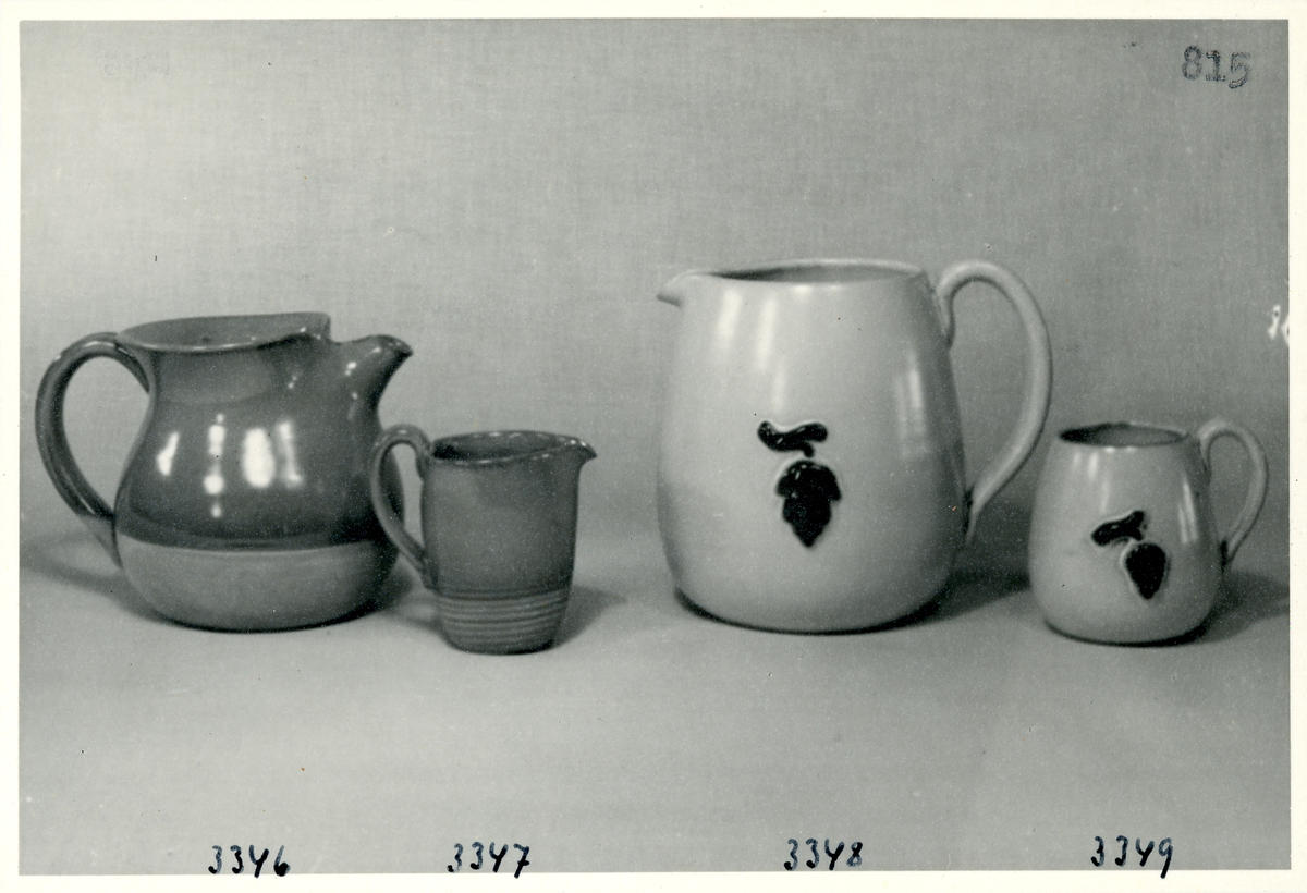 Tre kannor och en mugg från Bo Fajans, formgivare Eva Jancke-Björk, 1900-talets mitt. Kannan och muggen till höger i bild har en relief som dekor.