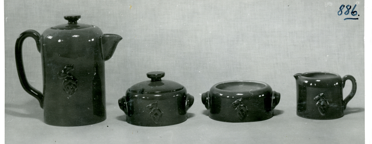 Kanna, skål med lock, sockerskål och gräddsnäcka från Bo Fajans, formgivare Eva Jancke-Björk, 1900-talets mitt.