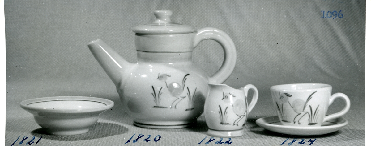 Servis från Bo Fajans, formgivare Allan Ebeling, tidigt 1900-tal. Sockerskål, kaffekanna, gräddsnäcka och kopp.