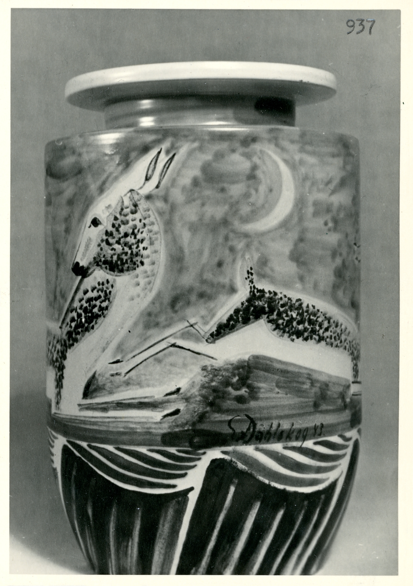 Vas från Bo Fajans, formgivare Ewald Dahlskog, 1900-talets mitt. På vasen går det att utläsa signaturen "E. Dahlskog 43".