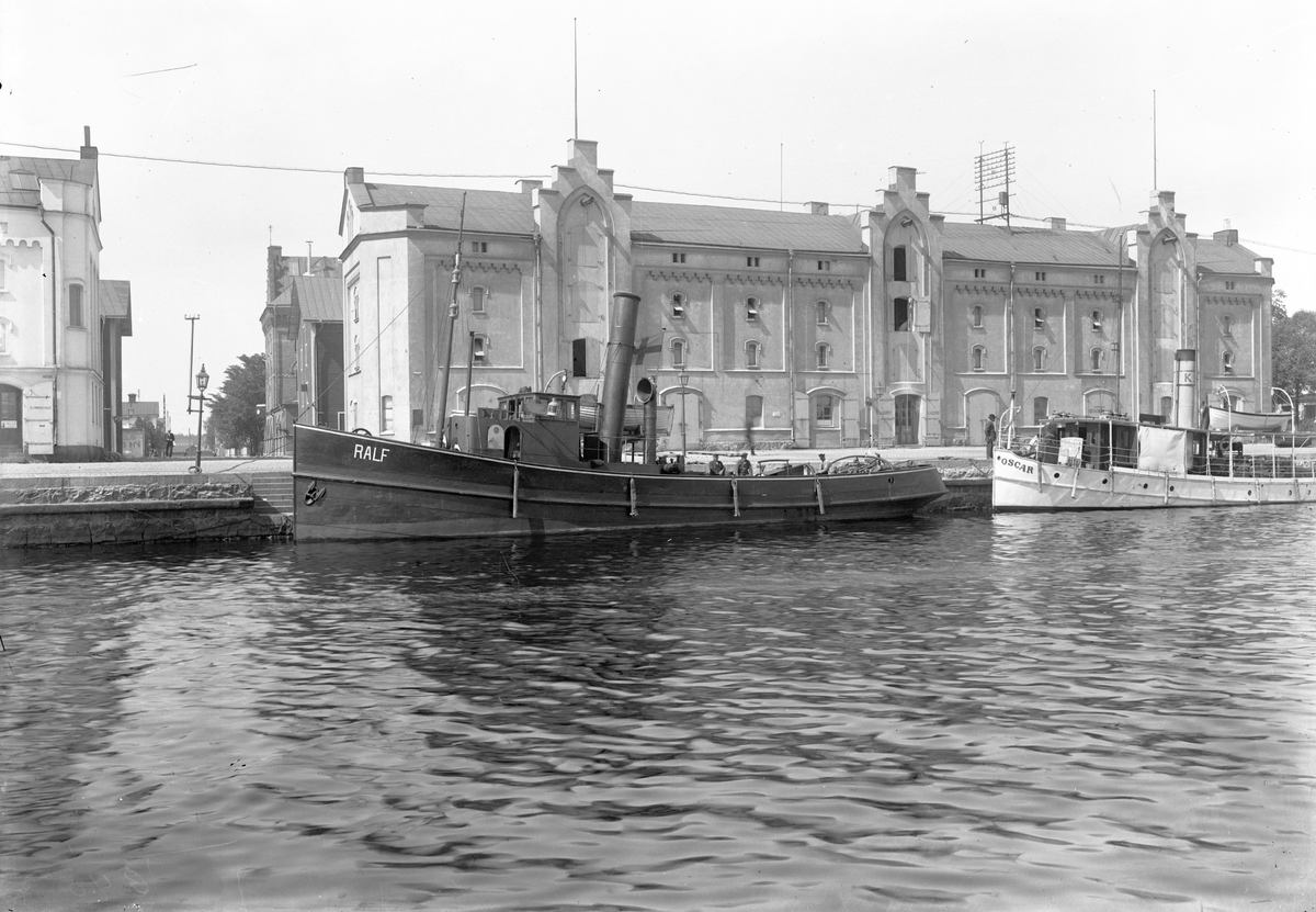 Ångfartygen "Ralf" och "Oscar" vid kajen utanför magasinhusen vid Norra Skeppsbron, tidigt 1900-tal.