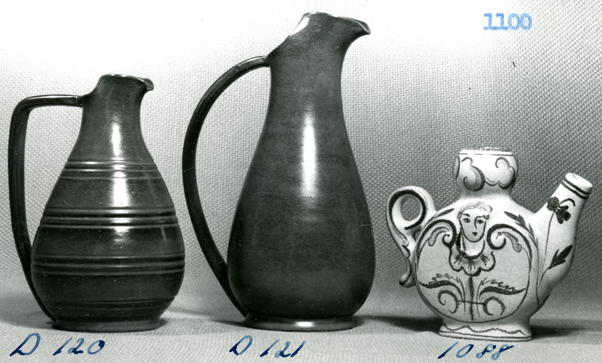 Två vinkannor samt ett krus med hänkel och pip från Bo Fajans, formgivna av Ewald Dahlskog och Allan Ebeling.