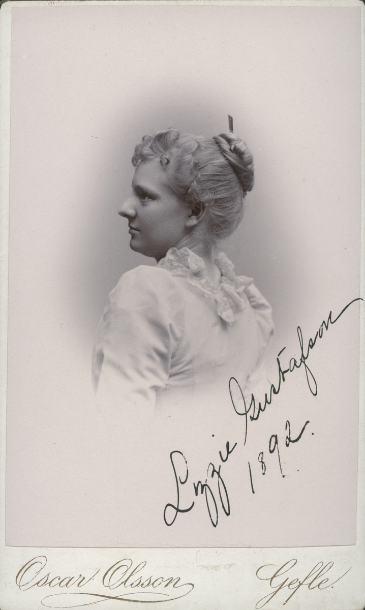 Kvinnoporträtt. Text framsida kort: "Lizzie Gustafson 1892".