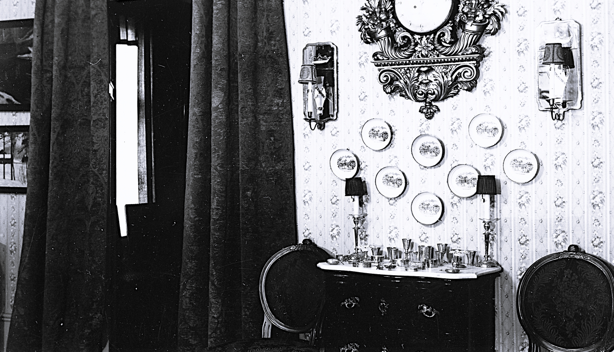 Ett rum med en byrå och prydnadstallrikar, lampetter och en klocka på väggen samt draperi och två stolar. Text i album: "Vårt hem - Salongen".