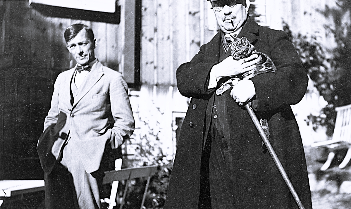 Två män som står framför en byggnad varav den till höger håller i en katt och käpp. Text i album: "Utfärd till Dalarne med Isaac Westergren och Albin Ekblom med Rolls-Royce, 1925".