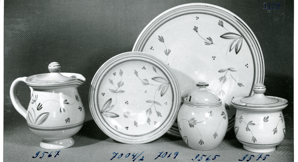 Titel: Teservis i G-dekor (vit glasyr med grön eller rödbrun dekor) från Bo Fajans, formgivare Eva Jancke-Björk, 1900-talets mitt.
