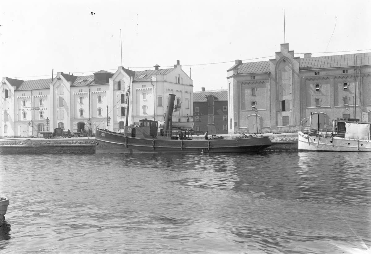 Ångfartygen "Ralf" och "Oscar" vid kajen utanför magasinhusen vid Norra Skeppsbron, tidigt 1900-tal.