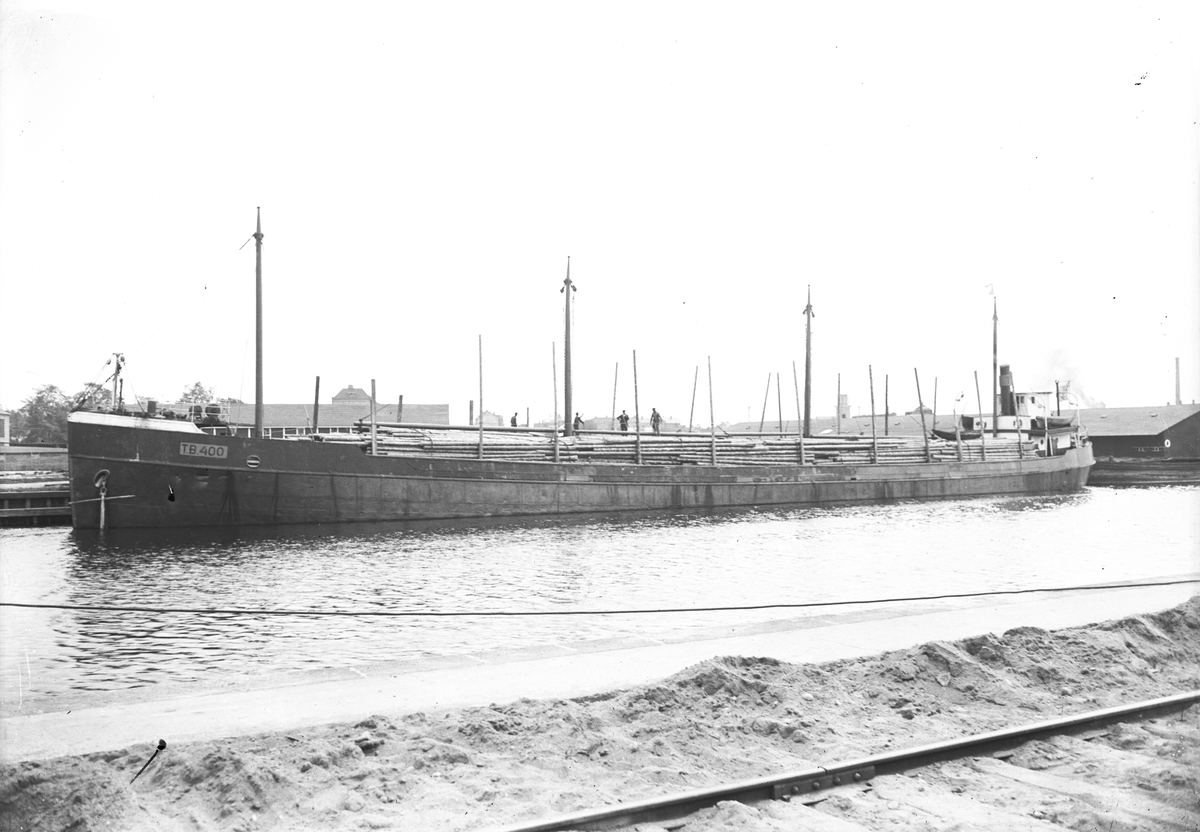 Pråm märkt "T.B. 400" lastad med timmer, Gävle hamn.